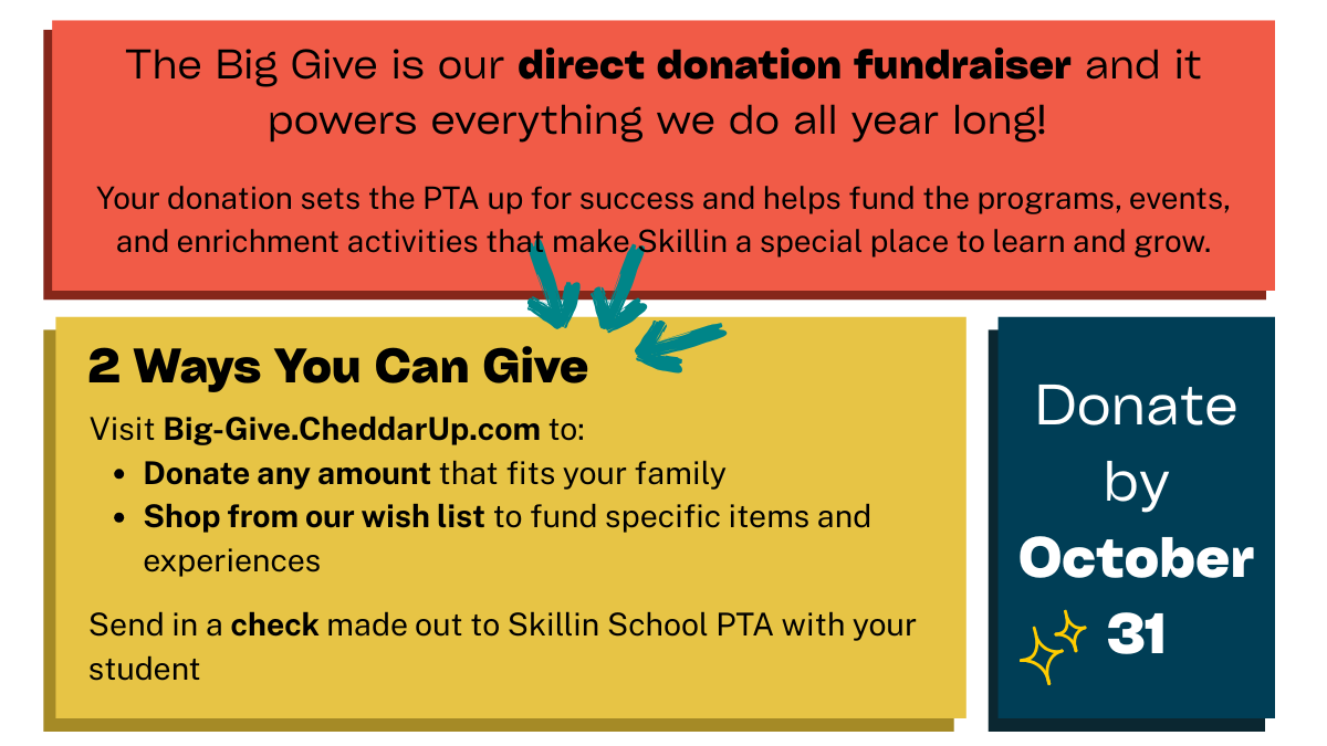 Contact your Human Resources Department and ask about “Matching Funds” for “501(c)(3)” charitable organizations like the Skillin School PTA.